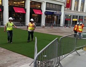 SYNLawn’s SYNTipede 354 was chosen for this project due to its ability to withstand very heavy traffic, as well as its HeatBlock feature, which reduces surface temperatures by approximately 20%. Shoppers, visitors and employees of the area are sure to appreciate the decision as they roam through the area during the busy holiday season. They may get so used to it, they’ll want to keep it there after the holidays are over. But that’s not the plan. After the holidays the artificial grass is removed, stored and ready to install again for the next 3 years of the life of this enormous project. The city is ready and so is SYNLawn!